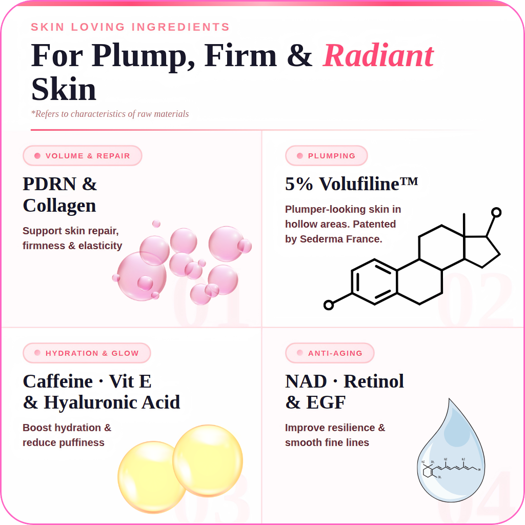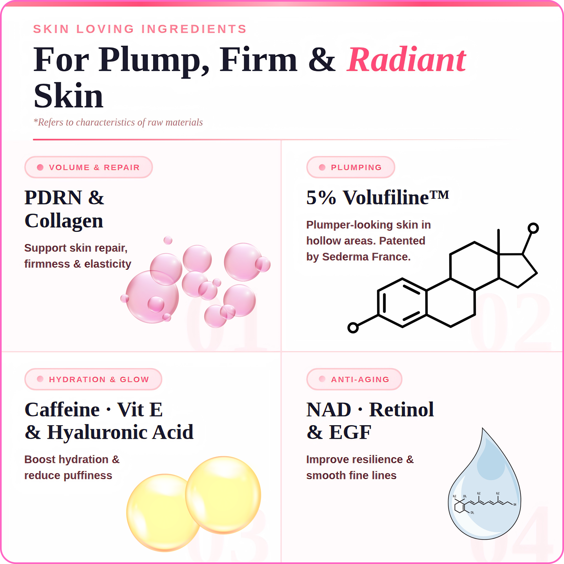 Formulated with PDRN, collagen & 5% Volufiline™ for visible results.